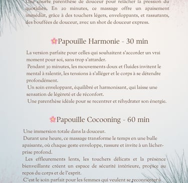 Les soins Papouilles sont des soins de relaxation sensorielle, pensés comme un temps pour se déposer, se relâcher et se reconnecter à son corps en toute sécurité.